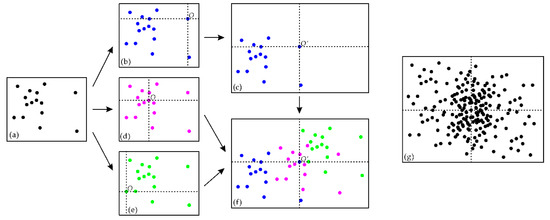 Schematic diagram for constructing a Fry plot: (a) the original sheet records raw points; (b) the origin O is placed on one of the raw points; (c) distribution pattern of raw points according to the origin O is transferred to the tracing sheet; (d,e) the origin O is re-placed on every raw point; (f) the tracing sheet records all distribution patterns of raw points with respect to different origins; and (g) Fry plot is constructed.