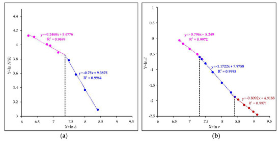 The box-counting log-log graph shows that the distribution of copper occurrences in the study area exhibits a bifractal pattern, i.e., the log-log plot of box number N(δ) versus box size δ can be fitted with two regression lines (Figure 4a), resulting in two fractal dimensions of 0.2468 (δ ≤ 1.6 km) and 0.75 (δ > 1.6 km). In contrast, the radial-density analysis yields a trifractal pattern, as indicated by three regression lines that represent three fractal dimensions varying from 0.796 (r ≤ 1.4 km), 1.1722 (between 1.5 and 4.5 km) to 0.8092 (r > 4.5 km) (Figure 4b). A single regression line represents a power-law (fractal) relationship between the measurements and their scales, implying a scale-invariance pattern resulted from a nonlinear process. In this study, the different fractal patterns of copper occurrences indicated by the multi-line fractal model could be ascribed to the different ore-controlling processes operating at different scales. It is noteworthy that the log-log graph, especially for radial-density analysis, seems to be alternatively fitted with one single regression line. However, the two-lines and three-lines fractal models shown in Figure 4 are assumed to be optimum because they reach the maximum regression coefficients (R2) of the fitted lines, meaning that the reduction of any regression line would lower the regression coefficients.