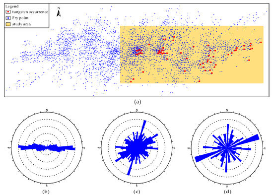 Fry plot records the distances and orientations of each raw point relative to every other point, thus enhancing subtle patterns of target point features [24], based on which rose diagrams are usually constructed to analyze preferential orientations of point pairs within specific distances that reveal the directional controls on mineralization at different map scales.