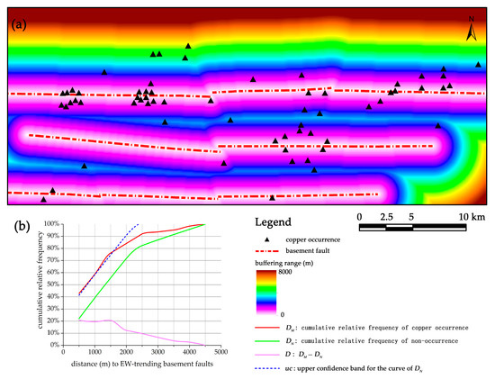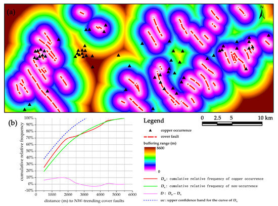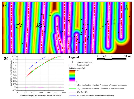 The NS-trending basement faults have a positive but weak association with copper occurrences beyond the buffer distance of 1 km, reaching only 2% higher frequency than what would be expected (Figure 7). However, the curve of DM is plotted below the upper confidence band of DN in the whole range of buffer analysis (Figure 7b), indicating that the weak association between NS-trending faults and copper mineralization is not of statistical significance.
