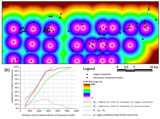 (a) Buffer analysis and (b) graph of cumulative relative frequency concerning distance to intersections of basement faults.