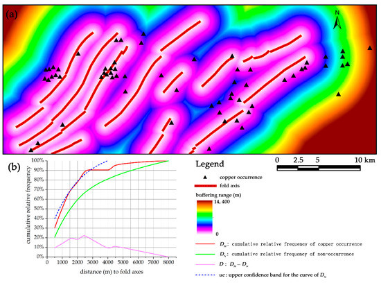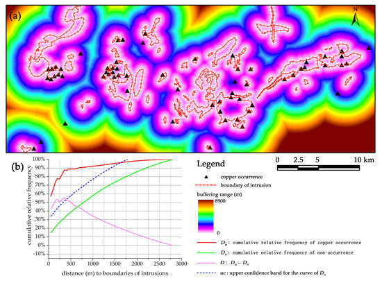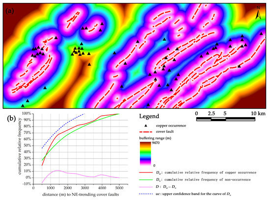 Distance distribution analysis is a spatially buffer-based method for quantifying spatial association between a set of points (i.e., mineral occurrences) and another set of spatial features [24,56]. This analysis involves calculating and comparing the cumulative relative frequency according to given distances from a certain set of geological features to (i) mineral occurrence locations (denoted as DM) and (ii) non-occurrence locations (denoted as DN). DN indicates naturally random probability density distribution of regular patterns within a given buffer distance, while DM presents a non-random probability density distribution of mineralized patterns that is characterized by unevenly clustering of mineral occurrences within the corresponding buffer. The difference D, which is calculated by (DM − DN), represents how much the cumulative frequency of mineral occurrences (i.e., DM) is higher or lower than that expected due to chance (i.e., DN), measuring the intensity of spatial association between the analyzed geological feature and mineralization.