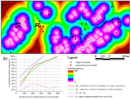 (a) Buffer analysis and (b) graph of cumulative relative frequency concerning distance to intersections of cover faults.