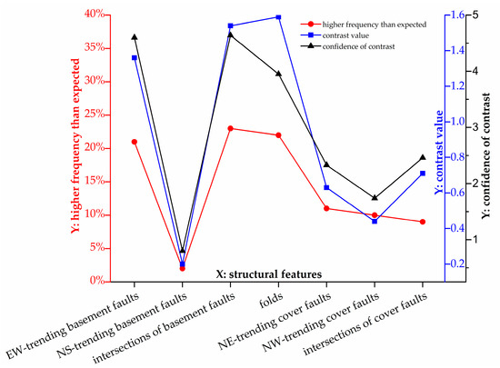 WofE analysis was also implemented to investigate the association of structural features with copper occurrences. At corresponding optimal buffer distances, the contrast values and confidences of contrast were calculated. As depicted in Figure 13 and Table 2, the EW-trending faults, intersections of basement faults and folds have top three highest values of both contrast and confidence of contrast, which are remarkably greater than those of the other structural features. The contrasts and confidences of contrast, which can assist in evaluating the intensity of spatial association, show exactly the same variations as the results derived from distance distribution analysis, implying that the EW-trending faults, intersections of basement faults and folds are plausibly major structural controls on copper mineralization in the TOD.