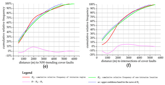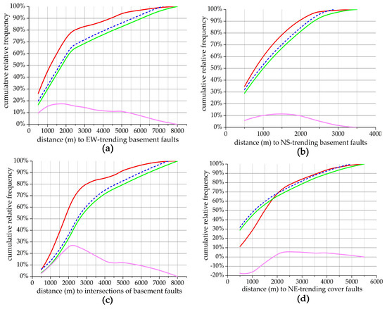 Graph of cumulative relative frequency concerning distance to (a) EW-trending faults; (b) NS-trending faults; (c) intersections of basement faults; (d) NE-trending faults; (e) NW-trending faults and (f) intersections of cover faults.