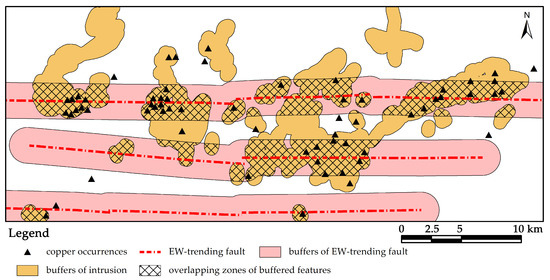 It is noteworthy that the EW-trending faults and intersections of basement faults, which show the strongest correlations with intrusions, also exhibit significant associations with copper occurrences in the previous distance distribution analysis. It is necessary to evaluate what extent of these structural controls on intrusion determine their strong correlations with copper mineralization. The EW-trending faults and Yanshanian intrusions were buffered with their optimal distances, and the copper occurrences located within the corresponding buffered zones were counted. It appears that 98% (47 out of 48) of the copper occurrences distributed within the buffers of EW-trending faults are located in the overlapping zones of the buffered EW-trending faults and intrusions which account for 33.58% of total area. Only one occurrence is included in the buffered zones where intrusions are absent (occupying 66.42% of total area) (Figure 16). Likewise, 96% (49 out of 51) of copper occurrences located within the buffers of intersections of basement faults are included in the overlapping zones of buffered intersections of faults and intrusions that occupy 37.11% of total area (Figure 17). It is inferred that the significantly strong associations of EW-trending faults and intersections of basement faults with copper mineralization are attributed to the controls of these structural features on intrusions.