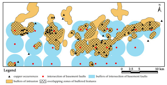 Buffer analysis showing the distribution of copper occurrences in buffered intersections of basement faults and intrusions.