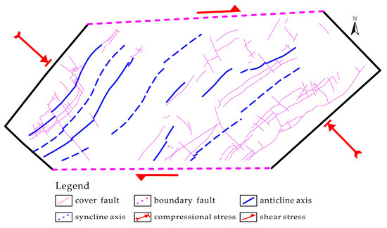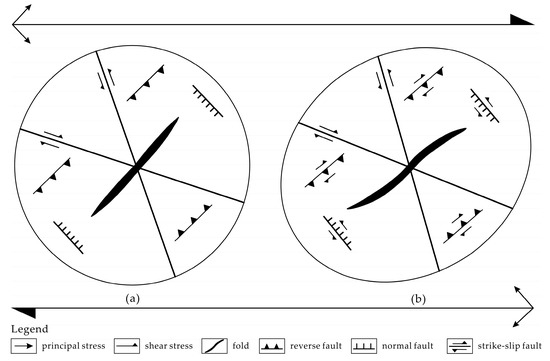 Deformation model of dextral shearing in a strike-slip fault zone, modified from [61]. (a) a structural system formed in initial stage of deformation; and (b) a rotation of structural elements during continued strike-slip shearing.