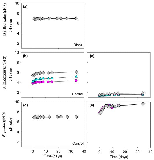 For A. thiooxidans, in the control (growth medium pH adjusted to 3.5), pH is higher at a higher pulp density. For 5 g/L the pH varies from 3.8 to 4.3, for 10 g/L it varies from 4.1 to 5.2, and for 30 g/L from 5.3 to 6.0. When A. thiooxidans is inoculated, the pH is consistently low (1.6 in average) for all pulp densities. The low pH is the result of the sulfur oxidation by A. thiooxidans using dissolved oxygen as the electron acceptor, and the resulting H2SO4 production [57]. In the case of P. putida, the control (growth medium pH adjusted to 7) has a pH close to 7 and no differences were observed according to the pulp densities. However, in the reactors where P. putida is inoculated, the pH increases significantly from 7 to 9.2 in the first five days, whatever the pulp density. Van Hullebusch et al. [58] explained the pH increase in slag leaching as a result of the initial dissolution of cations such as Ca2+ and Mg2+, followed by neutralization by H+ from H2O. Potysz et al. [59] also reported a pH increase in Cu slags leaching due to H+ replacing Fe2+ during fayalite dissolution. In batch reactors inoculated with P. putida, dissolved oxygen increases from 0 on the first day to 4.7 mg/L on the fifth day, and remains constant for the rest of the sampling time (Figure S1).