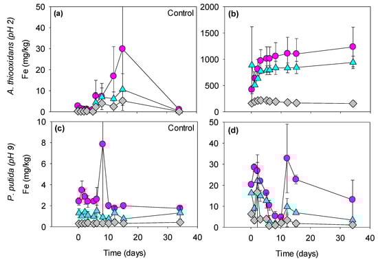 In the present work, two bacterial strains, A. thiooxidans and P. putida, were used for acidic and alkaline leaching conditions, respectively. In the previous section, the leaching of chromite tailings was discussed without including the possible bacterial effects. However, the differences in element concentrations observed over time (Figure 4, Figure 5, Figure 6, Figure 7 and Figure 8) between blanks, controls, and batch experiments inoculated with both strains, indicate that bacteria may play an important role in tailings leachability, other than as a simple pH controller. Despite Schindler et al. [11] finding no direct bacterial effect on the release of Cr from altered chromatites, they affirmed that the presence of bacteria in tailings, mine waste piles, and soils may control pH and Eh and thus indirectly control Cr redox chemistry. Under this premise, the role of bacteria on Fe and Cr mobility, as the most abundant compounds on tailings, was selected to discuss this point.