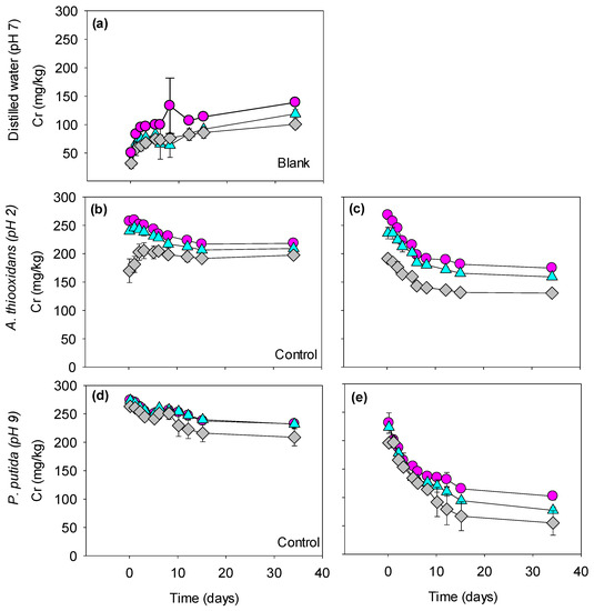 The amount of total chromium extracted in the batch experiment with A. thiooxidans decreases over time. It has been reported that A. thiooxidans, A. ferrooxidans, and Thiobacillus thioparus are capable of Cr(VI) reduction when they are growing on sulfur compounds due to the production of a series of sulfur compounds with a high reducing power [28,74]. According to Viera et al. [74], in A. thiooxidans cultures, reduced glutathione is a required intermediate for the oxidation of elemental sulfur. The polysulfide formed is then successively oxidized to different compounds like sulfite, thiosulfate, and finally sulfate. Sulfite and polythionates could be responsible for reductive reactions. In addition, reducing compounds associated with sulfur particles (less than 3 µm) could promote Cr reduction in A. thiooxidans cultures [75]. Steudel [76] found that colloidal sulfur in cultures of Acidithiobacillus would be present as long-chain polythionates, forming micelles of globules of up to a few µm. Later, Viera et al. [74] observed that at pH 2 and 4, A. thiooxidans cultures reached higher free bacterial populations but lower chromium reduction values. Thus, the higher the pH, the higher the amount of reducing compounds associated with the colloidal sulfur and cells. Taking into consideration that in the present work the Cr(VI) leached out due to the presence of PO43− in the medium, the Cr decrease could be explained by the reduction of Cr(VI) to Cr(III) mediated by the presence of A. thiooxidans and the low pH.