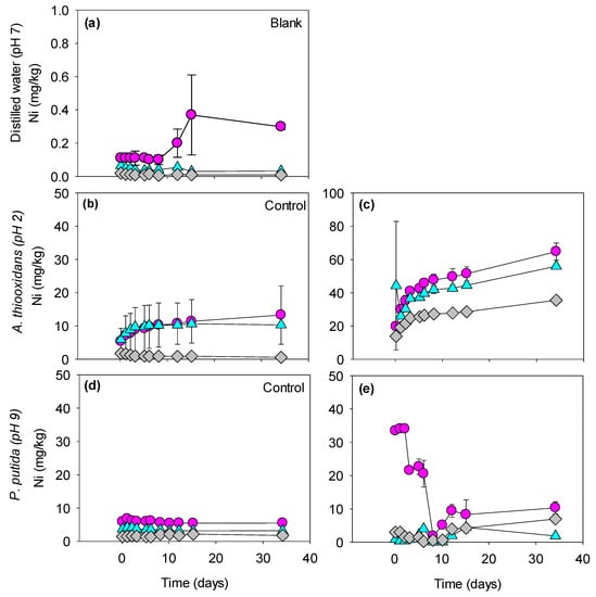 The leaching of the fresh tailings sample with distilled water showed that Ni in the leachate was lower than 1 mg/kg for all pulp densities. In the incubation with A. thiooxidans, the extracted Ni concentration increased over time. For a pulp density of 5 g/L, the Ni extracted goes from 20 to 65 mg/kg, for 10 g/L is between 44 and 56 mg/kg, and for 30 g/L is between 14 and 36 mg/kg. The A. thiooxidans medium composition (Figure 6b) induces Ni leaching from the fresh tailing sample; however, it only corresponds to the 20% of the Ni extracted under acidic conditions in the batch reactor incubated with A. thiooxidans. This indicates that the growth of A. thiooxidans promotes the leaching of Ni. In the leaching experiments with P. putida, Ni tends to decrease from the first day (33 mg/kg for 5 g/L, 6 mg/kg for 10 g/L, and 3 mg/kg for 30 g/L) to the sixth day (20 mg/kg for 5 g/L, 0.5 mg/kg for 10 g/L and 0.2 mg/kg for 30 g/L), and after this, part of it is re-solubilized and/or more Ni is leached from the tailings. The P. putida medium composition effect is negligible.