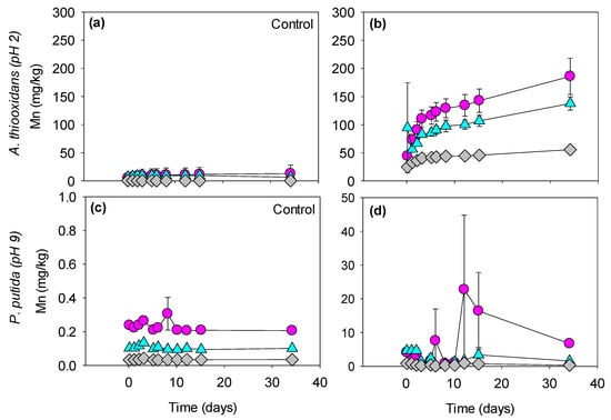 Mn concentration in the leachate as a function of time, during (bio)leaching experiments of the fresh tailing sample with A. thiooxidans (b) and with P. putida (d). Controls for A. thiooxidans and P. putida are displayed in (a,c), respectively. Three pulp densities were evaluated: 5 g/L (