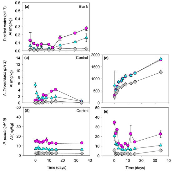 Al concentrations in the leachate as a function of time during (bio)leaching experiments of the fresh tailing sample with distilled water (a), incubated with A. thiooxidans (c) and P. putida (e). Controls for A. thiooxidans and P. putida are displayed in (b,d), respectively. Three pulp densities were evaluated: 5 g/L (