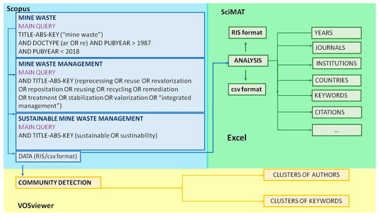 Moreover, the use of mapping tools enables the identification of collaboration areas between some actors [37]. Thanks to these tools, the bibliographic information of a database can be shown, as well as main research trends [38,39]. Links between authors of different subject areas, institutions and countries can be viewed graphically. This application has been very useful and relevant in areas where international collaboration is essential, as is the case for the mineral sector [40].