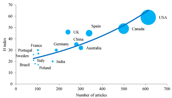 Table 3 shows the 10 most productive countries in the publication of articles on MW. The United States led the group, followed by Canada, Spain, Australia, and China. The number of articles published per million inhabitants (APC) is also shown in this table. This variable is led by Canada with 13.75 articles per capita, followed by Australia with 12.47, Portugal with 10.07, and Spain with 7.29. The United States placed first in the total number of citations, followed by Canada, Spain, and the United Kingdom. However, considering the average number of citations per article, the United Kingdom placed first with 29 citations per article, followed by the United States with 22.3, Spain with 21.4, Portugal with 19.2, and Canada with 18.1. Figure 3 shows the elevated correlation existing between the H index and number of articles published by each country.