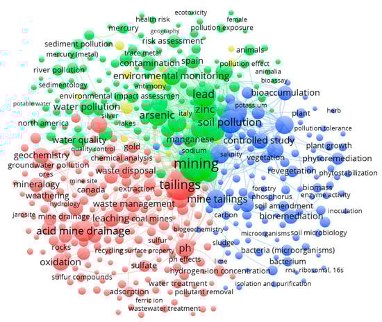 The keywords analysis that was used in the articles studied showed that various mining products were among the most frequently used words, including: zinc, lead, copper, metals, heavy metals, iron, and arsenic. The most common terms related to processes and mining elements were: “tailings”, “acid mine drainage”, “concentration”, “industrial waste”, “oxidation”, and “environmental monitoring”. The most common terms related to soil contamination were: “soils”, “soil pollutants”, “pH”, and “soil pollution”. The network mapping of co-occurrence of keywords revealed three different clusters focused on contamination and public health, waste management, and environmental restoration.