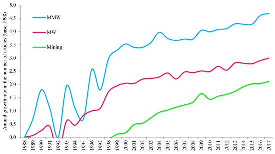 In this section, we present the main analysis results of the evolution of worldwide research into the management of mining waste (MMW) during the period of 1988 to 2017. Table 8 shows the evolution of the principle indicators of research in this field. The number of articles on MMW (A) increased from one in 1988 to 100 in 2017. To contextualize the increase in articles in this line of research, Figure 6 displays the growing trend in the number of research articles on mining, mine waste (MW), and the management of mine waste (MMW). To facilitate the comparison and homogenize variables, logarithms were applied to them, and the annual average accumulated growth rate was calculated. As a result, although articles on mining increased by 7.54% on average per year, those on MW increased by 10.87%, and those on MMW increased by 17.52%. Figure 6 shows a great variability regarding the growth trends of the published articles on these three fields of research until the last decade of the 20th century. As far as the growth trend of mining articles (in green) is concerned, it did not start to be positive until 1998. Therefore, in the field of mining research, MW and particularly MMW have become increasingly important.