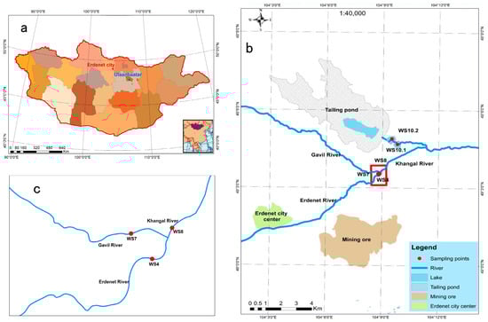 Study area with sampling locations: (a) Erdenet mine in Mongolia, (b) Erdenet mining area with sampling locations, and (c) the junction of the three rivers with sampling locations.