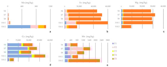 Results of the sequential extraction of river (S4, Erdenet River; S7, Gavil River; and S8, Khangal River) and pond (S10.1 and S10.2) sediment samples for Mo (a), Fe (b), Mg (c), Ca (d), and Mn (e).