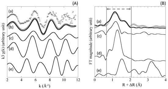 Extended X-ray absorption fine structure (EXAFS) analysis was performed using software (REX2000; Rigaku Corp., Tokyo, Japan) with theoretical backscattering amplitudes and phase-shift functions obtained using FEFF 8.5 []. The Fourier transformation of the k3χ(k) oscillation from k space to R space was performed in the range of 3.0–13.25 Å−1 to obtain radial structural functions (RSFs) for Mo. The quality of fit was given by the goodness of fit parameter. Details of the experiments and fitting procedure were presented by Kashiwabara et al. [].