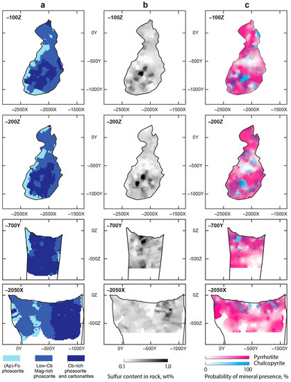 Distribution of rock types (a), sulfur content (b) and probability of pyrrhotite and chalcopyrite presence (c) within the Kovdor phoscorite-carbonatite complex.