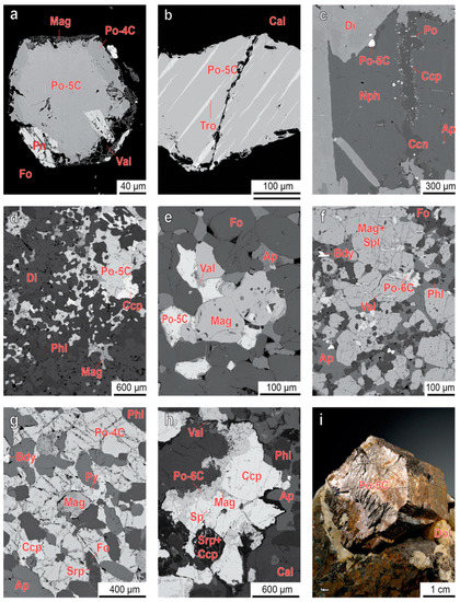 Typical pyrrhotite morphology in rocks of the Kovdor massif: (a) pseudohexagonal crystal of pyrrhotite-5C with inclusions of pentlandite replaced with pyrrhotite-4C (F-phoscorite 927/87.4); (b) exsolution inclusions of troilite in pyrrhotite-5C (a, phoscorite-related carbonatite 924/26.7); (c) plate crystals of pyrrhotite-5C in cancrinitized nepheline (foidolite 949/209.2); (d) irregularly shaped intergrowths of pyrrhotite-5C, magnetite and chalcopyrite (diopside-phlogopite rock 1010/619.4); (e) intergrowth of pyrrhotite-5C with magnetite (AF-phoscorite 956/70.7); (f) interstitial aggregates and veinlets of pyrrhotite-6C in magnetite (MAF-phoscorite 905/160.0); (g) aggregates of pyrrhotite-4C in a sulfide segregation (CMAF-phoscorite 1004/656.5); (h) granular rims of pyrrhotite-6C around chalcopyrite grains (phoscorite-related carbonatite 975/270.0); (i) well-shaped crystal of pyrrhotite-5C (vein dolomite carbonatite K-2011-5). BSE-images (a–h) and macrophoto (i). Mineral abbreviations see in the Section 2.