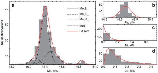 Chemical composition of pyrrhotite (Table 3, Figure 3a) varies from Me7S8 (pyrrhotite-4C) to MeS (pyrrhotite-2C), with intensive maximum at Me9S10 (pyrrhotite-5C). Approximation of total metal content histogram by the corresponding Gaussians with fixed positions at Me = 46.66 for Fe7S8, 47.36 for Fe9S10, 47.82 for Fe11S12 and 50.00 for FeS has confirmed a sharp predominance of pyrrhotite-5C with subordinate roles of 6C, 4C and, especially, 2C modifications. Contents of iron and sulfur are distributed in accordance with normal law (Figure 3b), while cobalt and nickel are characterized by lognormal and exponential distributions correspondingly (Figure 3c,d).