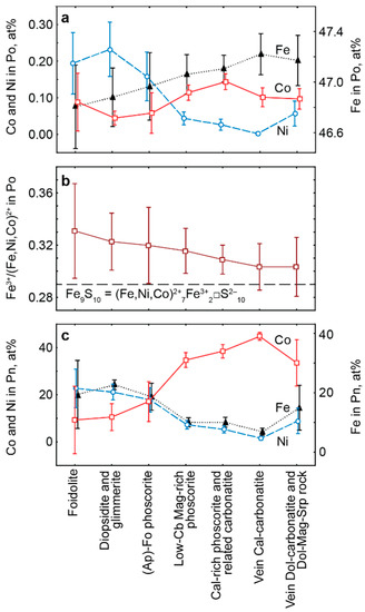 Similar to nickel content in the rocks (see Table 2), the amount of Ni in pyrrhotite gradually decreases from host foidolite and diopsidite–glimmerite to marginal (apatite)-forsterite phoscorite, intermediate low-carbonate magnetite-rich phoscorite, calcite-rich phoscorite, phoscorite-related and vein calcite carbonatite, and then insignificantly increases in vein dolomite carbonatite and the related dolomite-magnetite-serpentine rock. In contrast, content of Co both in rock and pyrrhotite increases from host silicate rocks and marginal calcite-poor phoscorite to calcite-bearing phoscorite and phoscorite-related carbonatite and then slightly decreases in the vein carbonatites (Figure 4c). Correspondingly, Ni-dominant pyrrhotite is concentrated in the marginal zone of the phoscorite-carbonatite complex, Ni-Co-bearing pyrrhotite occurs in the intermediate zone, and Co-dominant pyrrhotite occupies the axial zone of the pipe (Figure 5b).