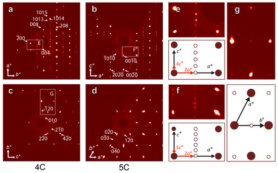Reconstructed sections of reciprocal space obtained for (h0l) and (hk0) sections for 1 (a,c) and 4 pyrrhotite samples (b,d) and enlarged fragments of these sections (e–g). For sample 1, there was used the transformation matrix [010 001 100]. White arrows and numbers indicate reflections and its indices. On corresponding schemas, large dark red circles and small unfilled circles belong to the hexagonal cell (a = 3.43, c = 5.68 Å) and supercell respectively; black and red arrows indicate subcell and supercell vectors respectively.