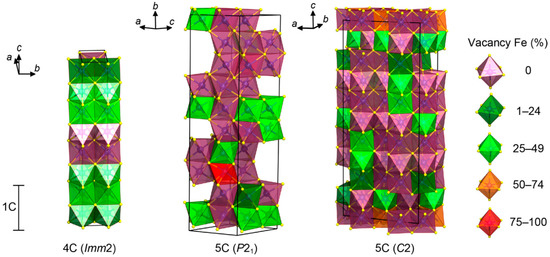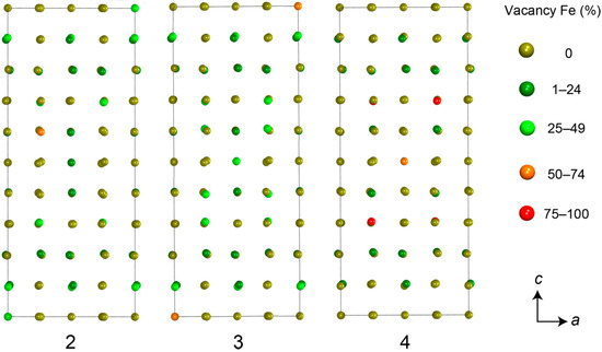 The crystal structure of ferrimagnetic pyrrhotite-4C, Fe6.78S8, was refined in the Imm2 space group. It differs from the previous refinements of crystal structure of stoichiometric Fe7S8 in C2/c and C2 space groups [51,56] by distribution of vacancies in Fe sites (Figure 7) based on the observed differences in their chemical compositions. The Kovdor pyrrhotite-4C contains four independent iron sites with refined occupancies of 0.89, 0.75, 1 and 0.75 for Fe1, Fe2, Fe3 and Fe4 respectively.