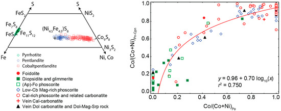 On the M9S8 plane of the Fe-Ni-Co-S tetrahedron (Figure 12), chemical compositions of pentlandite are concentrated within the field of the solid-solution stability at ≥200 °C [58]. Chemical compositions of cobaltpentlandite correspond to the Fe4.5Ni4.5S–Co9S8 trend, whereas most samples from host silicate rocks, marginal forsterite-dominant and intermediate low-carbonate magnetite-rich phoscorite are within the stability field at 300–400 °C, and most samples from axial carbonate rich phoscorite and carbonatites are within the stability field at 200–400 °C.
