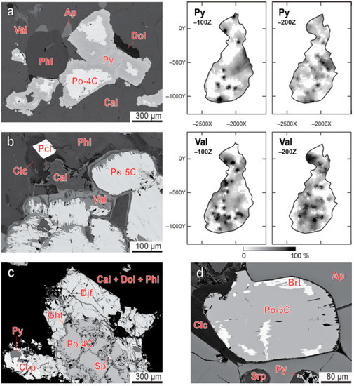 In the Kovdor rocks, major concentrators of sulfur are sulfides, mainly, pyrrhotite and chalcopyrite (Figure 1c), while sulfates, mainly, barite, are the products of low-temperature alteration of sulfides. Pyrrhotite is a common accessory to a rock-forming mineral of the most phoscorite and carbonatites varieties, apart from vein dolomite carbonatite and the related dolomite-magnetite-serpentine metasomatic rock. Chalcopyrite is closely associated with pyrrhotite, being predominantly concentrated in сarbonate-rich phoscorite, phoscorite-related carbonatite and vein calcite carbonatite of the ore-pipe apical part (up to 20 modal %). In the apical part of the pipe axial zone, there is calcite-rich phoscorite with rock-forming chalcopyrite (up to 30 modal %).