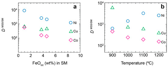 - Holzheid, A.; Palme, H. The influence of FeO on the solubilities of cobalt and nickel in silicate melts. Geochim. Cosmochim. Acta 1996, 60, 1181–1193. [Google Scholar] [CrossRef]