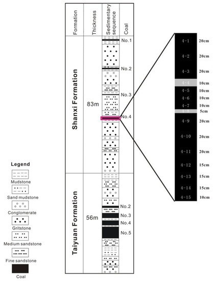 The Shanxi Formation has a total thickness of 20–80 m and is mainly composed of conglomerate, sandstone, siltstone, mudstone, and four coal seams identified as Nos. 1, 2, 3, and 4 coal, respectively, from top to bottom. The thickness of the coal seams ranges between 0.16 and 10.63 m (Figure 2). According to previous research, the Shanxi Formation was deposited in fluvial facies [22].