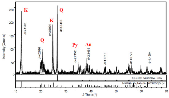 The mineralogical composition of the coal samples from No. 4 coal of the Yongdingzhuang Mine is primarily characterized by kaolinite and quartz and, to a lesser extent, by pyrite and anatase, based on the SEM-EDS and XRD analyses (Figure 3).