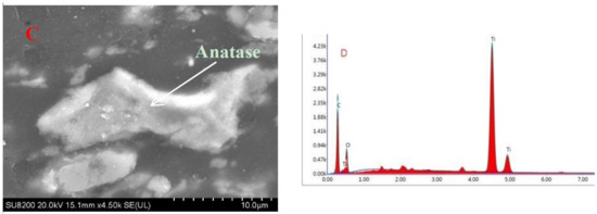 Pyrite and anatase in coals. (A) Pyrite in collodetrinite (oil immersion reflected light) (500×); (B) pyrite in fusinite (reflected light) (500×); (C) crystalline anatase (SEM, secondary electron image); and (D) energy dispersive X-ray spectrometry (EDS).