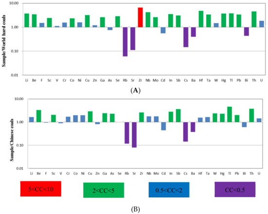 Concentration coefficients of trace elements in No. 4 coal; (A) normalized by average concentrations in the world hard coals; (B) normalized by the average concentration in the Chinese coals.
