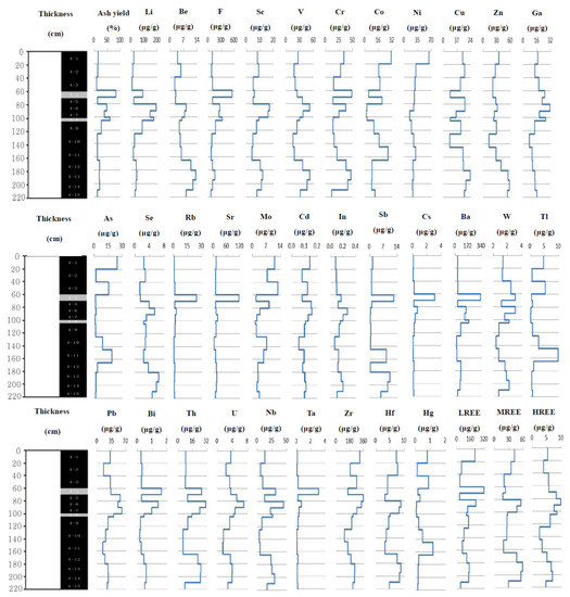 Concentration variations of trace elements and rare earth elements and yttrium (REY) as well as ash yield of the No. 4 coals.