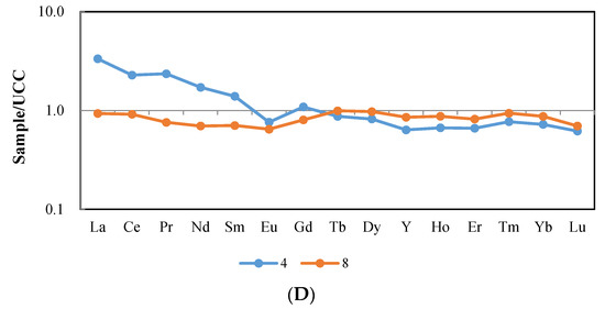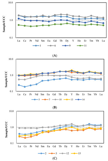 In general, to investigate the fractionation of REY concentrations in coal, the REY should be normalized by standard materials that have similar origins to coal [55,56]. As a result, it is advisable to use the UCC (Upper Continental Crust) as the standard reference for normalization rather than chondrite [56,57,58].