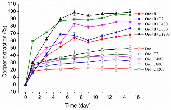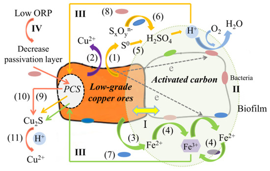 - Zhang, W.M.; Gu, S.F. Catalytic effect of activated carbon on bioleaching of low-grade primary copper sulfide ores. Trans. Nonferrous Met. Soc. China 2007, 17, 1123–1127. [Google Scholar] [CrossRef]