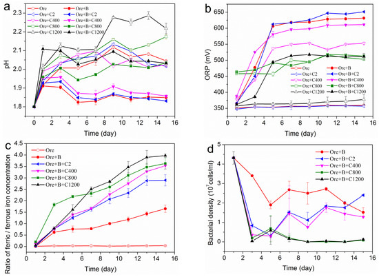 - Liang, C.L.; Xia, J.L.; Zhao, X.J.; Yang, Y.; Gong, S.Q.; Nie, Z.Y.; Ma, C.Y.; Zheng, L.; Zhao, Y.D.; Qiu, G.Z. Effect of activated carbon on chalcopyrite bioleaching with extreme thermophile Acidianus manzaensis. Hydrometallurgy 2010, 105, 179–185. [Google Scholar] [CrossRef]