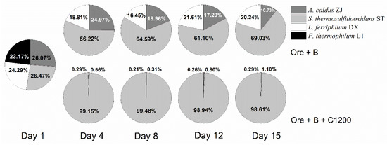 - Zeng, W.M.; Qiu, G.Z.; Zhou, H.B.; Peng, J.H.; Chen, M.; Tan, S.N.; Chao, W.L.; Liu, X.D.; Zhang, Y.S. Community structure and dynamics of the free and attached microorganisms during moderately thermophilic bioleaching of chalcopyrite concentrate. Bioresour. Technol. 2010, 101, 7068–7075. [Google Scholar] [CrossRef] [PubMed]