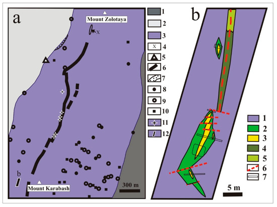 Geological position and types of hydrothermal-metasomatic rocks in the Karabash massif: (a) Spatial location of metasomatized rocks in the central part of the Karabash massif based on the geological map on a scale of 1:10,000 compiled by Lozhechkin [10] from the results of geological studies in 1933–1935. 1, Ordovician rocks of the Polyakovka Formation; 2, Devonian rocks of the Karamalytash and Ulutau Formations; 3, serpentinites; 4, diorite-porphyrites; 5, quartz diorite-porphyrites; 6–10, altered rocks: 6, rodingites: 7, listvenites; 8, epidote-chlorite-garnet; 9, magnetite-chlorite-carbonate; and 10, quartz-riebeckite; 11, mine workings (mines and adits) at the Zolotaya Gora deposit; and 12, location of the studied area. (b) Occurrence of lenses of magnetite-chlorite-carbonate rocks in the zone of foliated serpentinites in the west of the Karabash massif. 1, antigorite serpentinite; 2, chloritolite; 3, lenses of magnetite-chlorite-carbonate rocks; 4, intensely carbonatized serpentinite; 5, serpentinite with dispersed carbonate mineralization; 6, faults; 7, mine workings. Figure 2 is the reproduction of Figure 2 and Figure 3 published in Murzin et al. [8].