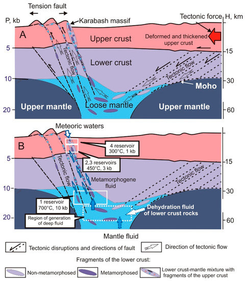 Our model of the formation of the Karabash massif (Figure 5A) is based on the concept of the “blocky folding of the Earth’s crust” [14]. According to this model, the upper elastic crust is divided into huge blocks by the thrusts dipping toward each other as a result of applied horizontal force. The thrusts result in bends and deformation of blocks, thickening in the vertical plane, and shortening along the compression axis. The thickening and shortening of the upper crust generated a tectonic flow in the lower elastic crust and caused its thermodynamic destabilization.