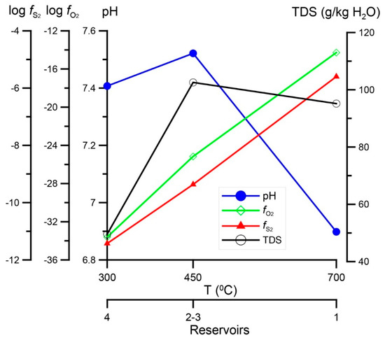 Sodium chloride-carbon dioxide ore-bearing fluid (log = −14.3, log = −5.44, pH = 6.9) increased total dissolved solids (TDS) to 100 g/L during interaction with the rocks of the second and third reservoirs, and thereafter, being diluted with meteoric water, stabilized at TDS = 50 g/L and pH = 7.4. Oxygen and sulfur fugacities depend mainly on temperature and gradually decreased in the range of log = −14/(−34) and log = −5/(−11) (Figure 7).