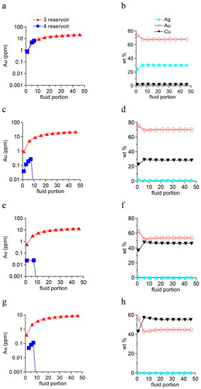 The Au-Ag-Cu solid solutions in the third reservoir at T = 450 °C were formed with the first portions of aqueous solution and their composition remained stable with further incoming solution. When the fluid source was in ultramafic rocks, the Cu-bearing Au-Ag solid solution with ratios (wt %) Au:Ag:Cu = 68:30:2 occurred. When the ratio of mafic rocks in the reservoir and the amount of ore components in the fluid increased, the solid phase contained silver-bearing Au-Cu solid solution with the amount of copper increasing from 28 to 55 wt % (Figure 8b,d,f,h). The sulfur fugacity (log ƒS2) was approx. −9.4. The comparison of different variants of the Au, Ag, and Cu ratios in the model solution at the preliminary stage became the basis for selecting ultramafic rocks with a minor fraction of mafic rocks as a source of ore components for further calculations.