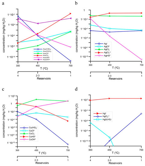NaCl-rich fluid determines the predominance of chloride complexes of Ag and Cu in the 1.–3. reservoirs (Figure 9b,c). In contrast to silver, the copper hydrocomplex CuOH0 is also present in the fluid. Mercury, opposed to Au, Ag, and Cu, is primarily present in the solution as Hg0, whereas chloride and sulfide complexes are minor (Figure 9d).