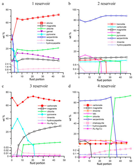 Mineral compositions of rocks in different reservoirs of the model are presented in Figure 10. The first reservoir corresponds to the lower crust rocks and has a stable set of minerals, dominated by olivine (to 70 wt %) accompanied by smaller amounts of garnet, magnetite, and chlorite (Figure 10a). In the second reservoir, imitating the deep fluid infiltration through serpentinites, magnetite (less than 10%) and carbonate (less than 3%) appear as minerals in equilibrium with serpentine. The other stages of the process are marked by the occurrence of pyroxene, talc, and tremolite (Figure 10b). Through the third reservoir, the fluid passed in a flow mode, interacting with a minor amount of host rocks (serpentinites), which can be interpreted as precipitation of minerals from the fluid in an open crack system. Within the third reservoir, a mixture of carbonate (to 70 wt %), magnetite (to 30 wt %) and a small amount of chlorite (to 5 wt %) was within open cavities and cracks. Pyroxene formed from the first portions of solution became unstable (Figure 10c). The composition of carbonate solid solution was dominated by calcite. In the fourth reservoir, mineral formation occurred in a closed system in which serpentinite was replaced by chloritolite, a rock composed of chlorite (to 90%) and small amounts of talc and carbonate (Figure 10d). Ilmenite and hydroxyapatite were accessory minerals in all reservoirs. In addition, chalcopyrite up to 0.2 wt % was formed in the fourth reservoir. Gold was deposited at all stages of the rock-water interaction during the formation of magnetite-chlorite-carbonate rocks (third reservoir) and at the initial stages in the fourth reservoir, when the transformation of serpentinites initialized (Figure 10c,d).