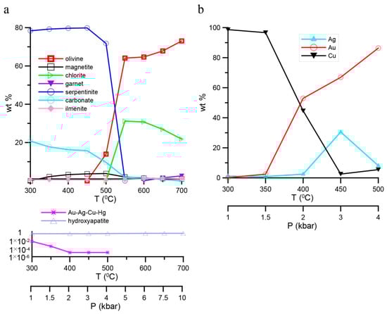 Mineral composition of (a) rocks and (b) Au-Ag-Cu solid solutions in changing pressure (P) and temperature (T) conditions.
